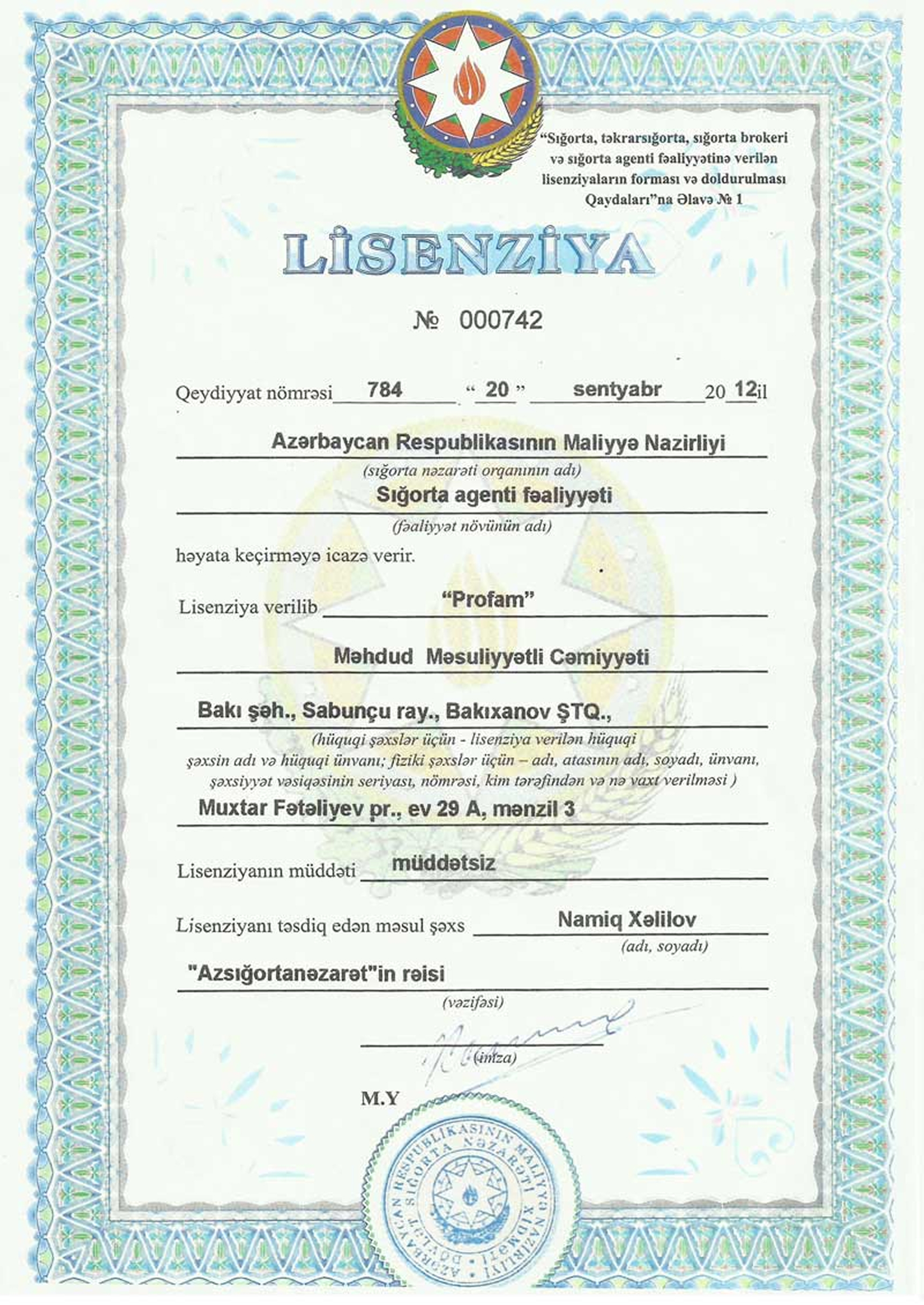 20.09.2012 tarixində şirkət sığorta agenti lisenziyası aldı!